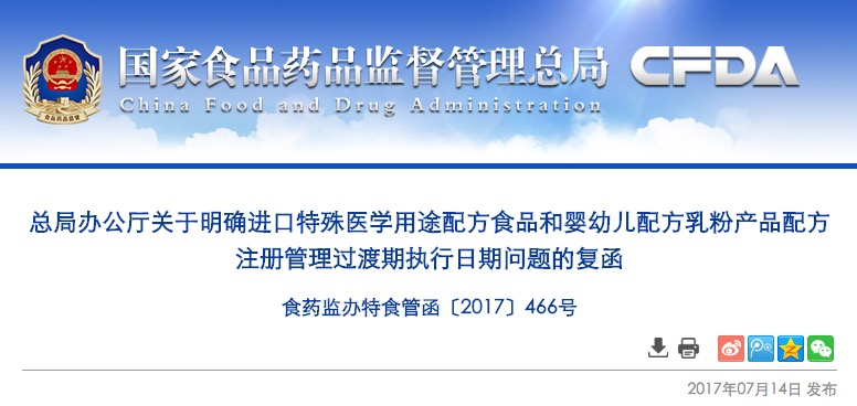 你局《關(guān)于特殊醫(yī)學(xué)用途配方食品注冊和嬰幼兒配方乳粉產(chǎn)品配方注冊要求中進口產(chǎn)品執(zhí)行日期問題的請示》(滬食藥監(jiān)食生函〔2017〕131號)收悉。經(jīng)研究,現(xiàn)函復(fù)如下: