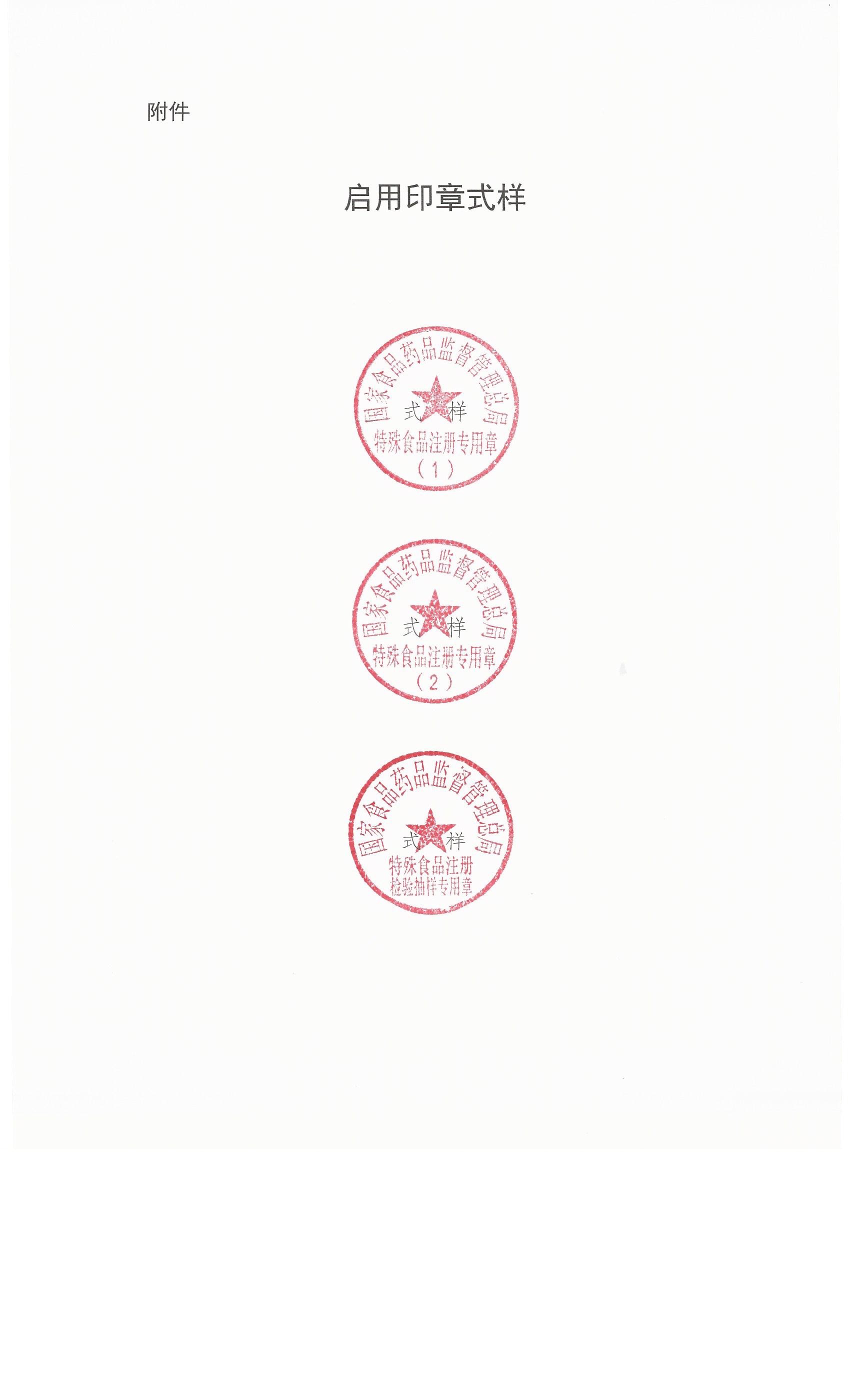 根據(jù)《保健食品注冊(cè)與備案管理辦法》(國(guó)家食品藥品監(jiān)督管理總局令第22號(hào))、《特殊醫(yī)學(xué)用途配方食品注冊(cè)管理辦法》(國(guó)家食品藥品監(jiān)督管理總局令第24號(hào))和《嬰幼兒配方乳粉產(chǎn)品配方注冊(cè)管理辦法》(國(guó)家食品藥品監(jiān)督管理總局令第26號(hào)),自2017年8月1日起,啟用“國(guó)家食品藥品監(jiān)督管理總局特殊食品注冊(cè)專(zhuān)用章(1)”用于保健食品注冊(cè),“國(guó)家食品藥品監(jiān)督管理總局特殊食品注冊(cè)專(zhuān)用章(2)”用于特殊醫(yī)學(xué)用途配方食品和嬰幼兒配方乳粉產(chǎn)品配方注冊(cè),“國(guó)家食品藥品監(jiān)督管理總局特殊食品注冊(cè)檢驗(yàn)抽樣專(zhuān)用章”用于特殊食品抽樣。