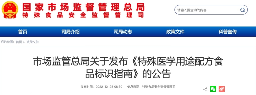 根據(jù)《中華人民共和國食品安全法》《特殊醫(yī)學(xué)用途配方食品注冊管理辦法》等法律法規(guī),市場監(jiān)管總局組織制定了《特殊醫(yī)學(xué)用途配方食品標(biāo)識指南》,現(xiàn)予以公告。